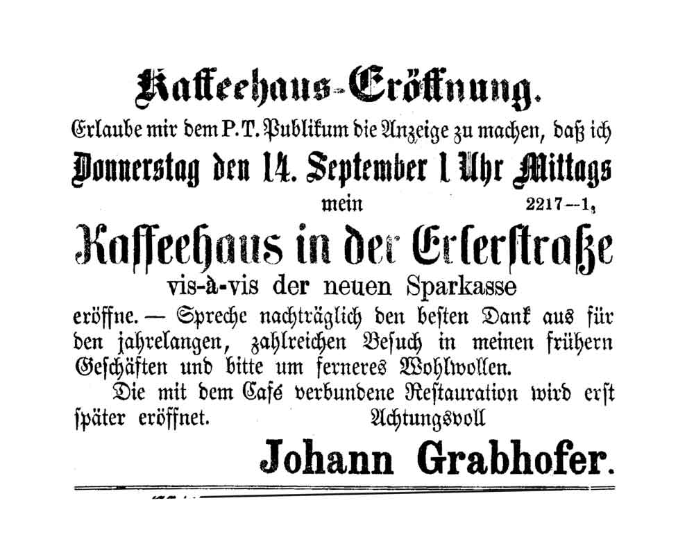 Endlich ist es so weit: Die Geburtsstunde des Café Central, das vorerst allerdings noch Café Grabhofer heißt. Das von Kaffetier Johann Grabhofer gegründete Kaffeehaus öffnet erstmals am 14. September 1876 um Punkt 1 Uhr mittags seine Pforten. Doch keine vier Jahre später verstirbt Grabhofer am 28. April 1880 und die dreistöckige Kaffeesiederei geht in den Besitz seiner Witwe über, die wiederum das Central an ihre Tochter und ihren Schwiegersohn weitergibt. Pächter in jenen turbulenten Jahren ist das Ehepaar Gottfried und Maria Geisberger.