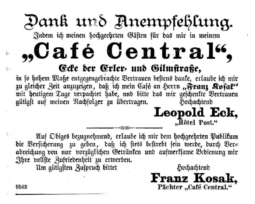 Als im April 1891 das Haus Erlerstraße 11 in den Besitz von Leopold Eck übergeht, ändert sich auch der Namen des Kaffeehauses in Café Central. Ob dabei das Wiener Café Central Pate stand, könnte man höchstens noch im Kaffeesud nachlesen. Als bestätigt gilt allerdings, dass zu jener Zeit bereits erstmals Konzerte im Kaffeehaus stattfinden. Und es wird auch damit geworben, dass am Nachmittag nur wenige Männer im Central sitzen und nicht geraucht wird. Wodurch nun auch Damen vermehrt die Vorzüge des Café Central kennenlernen.