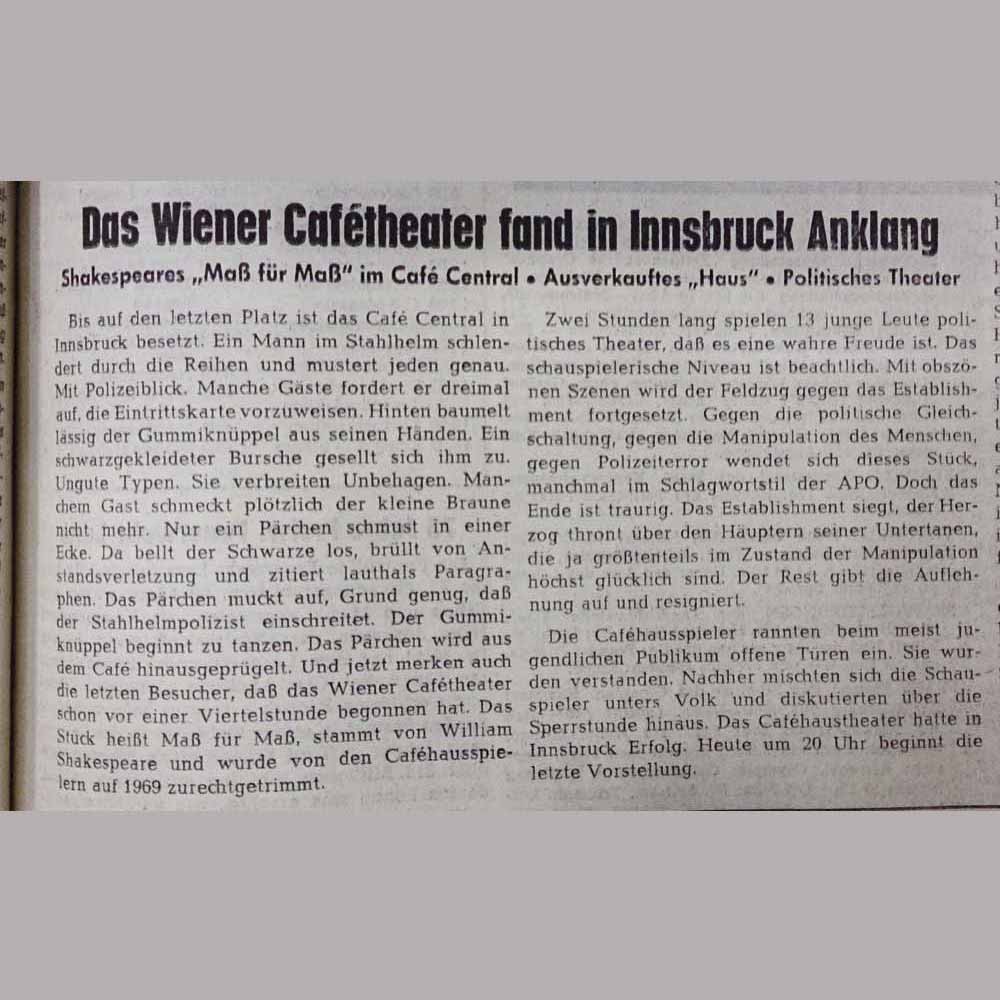 Nachdem Gastronomie-Legende Josef Falkner 1964 das Zeitliche segnet, erwirbt 1967 die Sparkasse Innsbruck das Hotel Café Central. Doch anstatt die Räumlichkeiten abermals in eine Bankfiliale umzubauen, heißt die Devise dieses Mal, das Kulturelle zu bewahren. Und auch die hartnäckigen Pläne, aus dem Central einen seelenlosen Kaufhaustempel zu machen, lösen sich gottlob schon bald in Luft auf. Stattdessen werden im Central erstmals auch Theaterstücke aufgeführt, die regen Anklang finden.