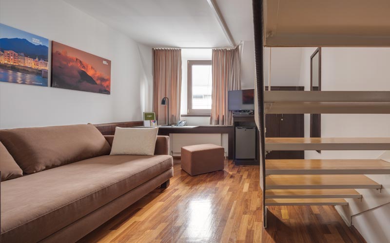 In unseren zweistöckigen Studios gibt es jeweils einen Wohnbereich mit Sitzecke, Schreibtisch und Badezimmer sowie einen Schlafraum mit separatem WC und Waschbecken. Während Sie auf beiden Wohnebenen einen Flat-TV mit Kabel-TV nutzen können, bietet der Wohnbereich einen Ausblick auf die Nordkette und der Wintergarten im Obergeschoss eine Aussicht auf die südliche Bergwelt Innsbrucks.